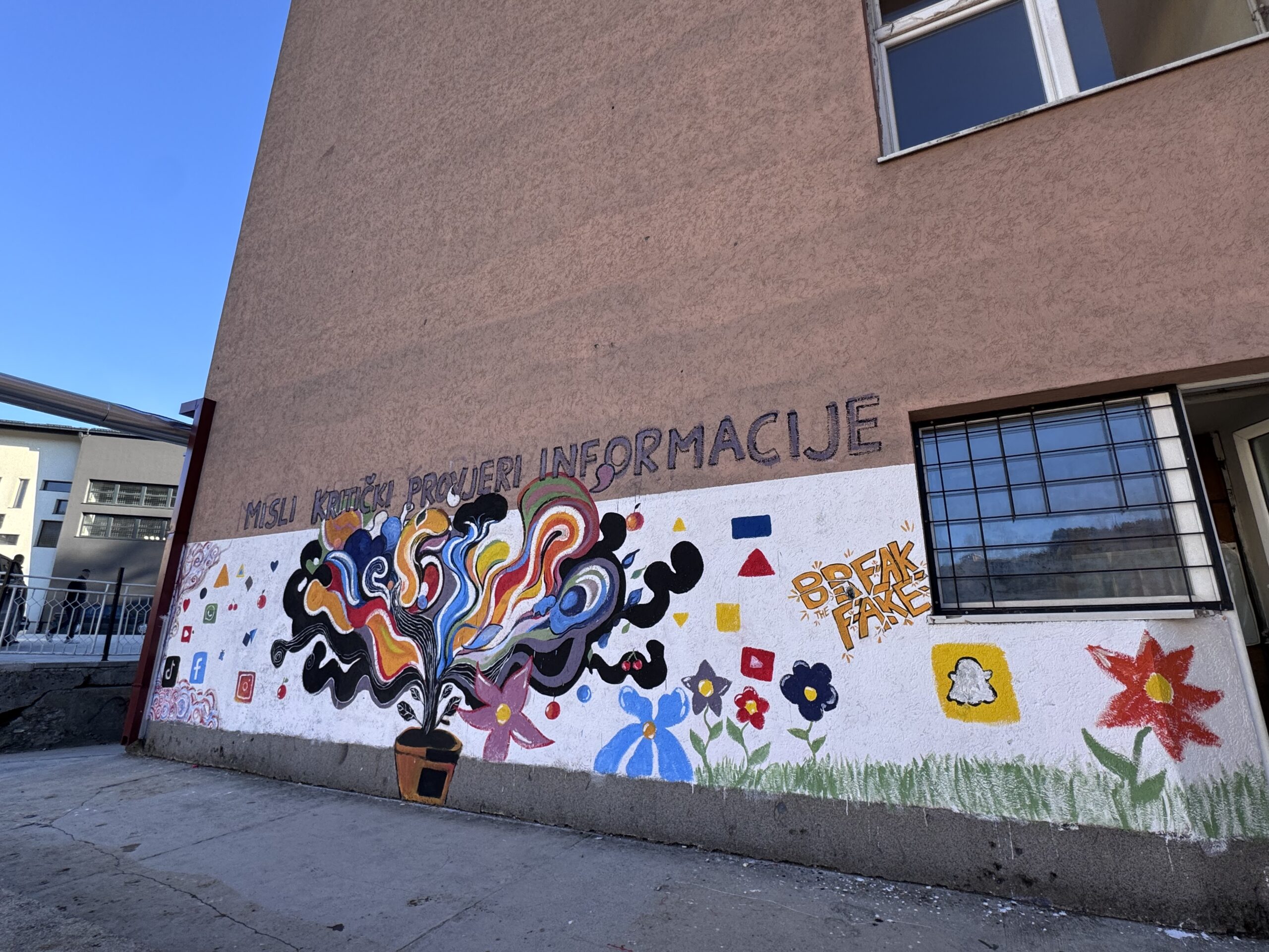 Mural „Misli kritički – provjeri informacije!“ realizovan je kao kreativna follow-up aktivnost projekta Break the Fake, s ciljem da se poruke medijske pismenosti trajno učine vidljivim u javnom prostoru. Kroz umjetnički izraz, učenici su vizualno artikulisali značaj kritičkog razmišljanja i odgovornog pristupa informacijama.